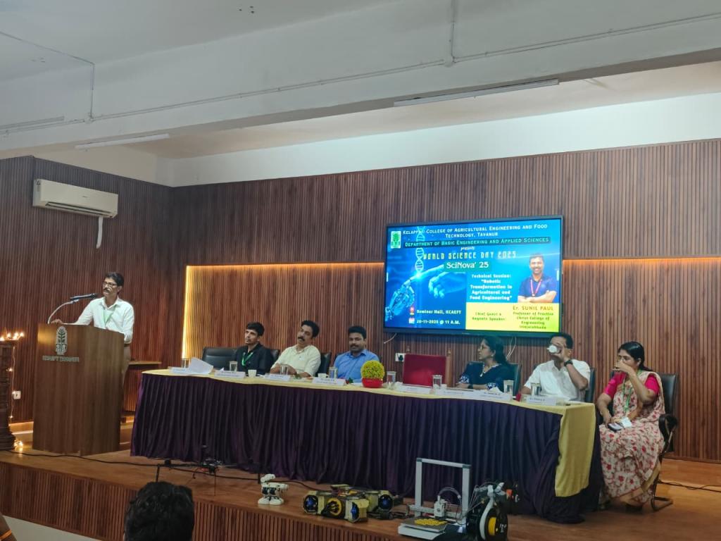 The World Science Day 2025 celebrated at KCAEFT-Tavanur: The **Scinova25** a series of events in line with the World Science Day 2025, were organized by the BEAS Department. Technical session like 'Robotic Transformations in Agriculture and Food Engineering' delivered by Er. Sunil Paul, Robotics Expert & Professor of Practice, Christ Engineering College (20.11.2025); Students' competitive activities like Sudoku, carrom, and Rubik’s cube have already been completed, while the debate, technical poster presentation, and still model competitions are upcoming.